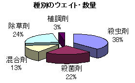 『平成13農薬年度出荷概況』について、先ず使用分野別に見ると果樹(100.9%)、分類なし(103.3%)の金額が前年を上回ったほかはすべて減少した(表1)。また、種別では植調剤(103.3%)の金額が増加したほかは、全て減少した。殺菌剤、混合剤の数量の落ち込みは水稲での減少が大きく影響した(表2、円グラフ)。さらに、剤型別動向では数量(108.3%)、金額(106.1%)ともゾル・フロアブル剤がかなり増加し、次いでその他剤(数量100.6%、金額105.1%)も増加したが、それ以外の剤型はすべて減少した(表3)。