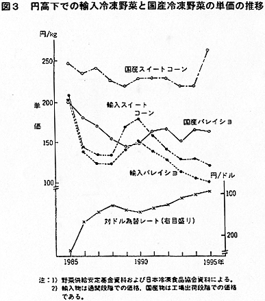 輸入価格の低下が起きたのは、改めて言うまでもなく、85年9月のプラザ合意を契機とした円高の進行によるものである。図3と図4において、冷凍野菜と生鮮野菜の各2品目を例に、円高開始後の国産物と輸入物の価格の推移を比較したが、いずれも円高の進行につれて輸入物の単価が国産物に比べ相対的に著しく低下したことが明らかである。特に冷凍物の単価は円高の進行に反比例して急速に低下したといえる。この低下が冷凍物輸入の86年からの急増に結果したとみて間違いないであろう。ちなみに、88年から90年にかけて円安に振れた時には、冷凍物の輸入単価は上昇し、輸入量はごくわずかな増加にとどまったのである。