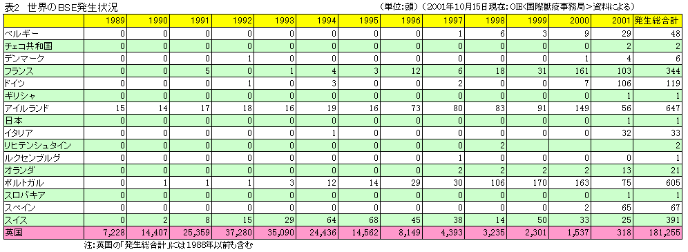 BSEは1986年に英国で発生が確認されて以降、英国では92年の3万7280頭をピークに今日までに18万頭強が確認されている。英国での発生は年々減少してきているが、昨年から今年にかけてEU諸国で発生が増大し、この9月にアジアで初めて日本がBSE汚染国の仲間入りをした(表2)。