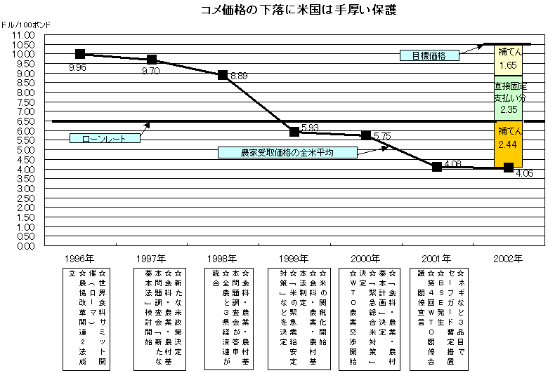 導入当時の96年、97年の穀物価格は高水準だった。そのため米国の生産者は、高い市場価格、直接固定支払い、自由な生産、という3重の恩恵を受けた。市場原理の導入で低米価に不安を募らせる日本の生産者とは対照的だった。