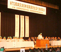 JA全中と全国農業者農政運動組織協議会は8月28日、「WTO農業交渉日本提案実現 全国代表者集会」を東京・日比谷公会堂で開いた。集会にはJA関係者など約2000人が参加。9月のWTO閣僚会議で日本は妥協することなく交渉し、農業の多面的機能など非貿易的関心事項への配慮を具体化することや、上限関税の設定に断固反対することなどの決議を採択、集会後はデモ行進し日本提案の実現を広く訴えた。