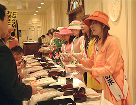 超党派の国会議員でつくる米消費拡大・純米酒推進議員連盟とJA全中、JA全農、日本酒造組合中央会が催したイベントで、参加道県のコメ娘18人が銘柄名を大書したたすきがけで華やかにアピール。 連盟の衛藤征士郎会長はじめ各党代表があいさつする中で、全中の宮田勇会長は「コメ改革に取り組み、おいしくて安全安心なコメづくりにさらにがんばる」と述べ、河村建夫文部科学相は「食育は和食にあり、学校給食は米飯に尽きる」と強調。米飯給食が週2回前後と少なかった神奈川や大阪でも回数が増えていることなどを報告した。 会場では全中のお米ギャラリーで出しているお米クレープやお米スープ、そして北米向け輸出用のコメなども披露された。 (2003.12.3) |