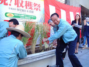 国際コメ年の今年、JAビルの周りに田んぼをつくり米づくりの過程を多くの人に見てもらおうと5月に田植えをした。品種はキヌヒカリ。これまでに「都会のなかで稲補を見るとほっとする」、「いつごろ稲刈りになるのか。できれば参加したい」といった声がJA全中に寄せられたという。 収穫祭でJA全中の宮田会長は「順調に生育しあたらめて自然の恵みを感じている。日本の米を腹いっぱいたべてほしい」などと集まった人に呼びかけたあと、稲刈りを行った。 そのほか餅つきも行われ紅白もちと稲穂が配られた。 |