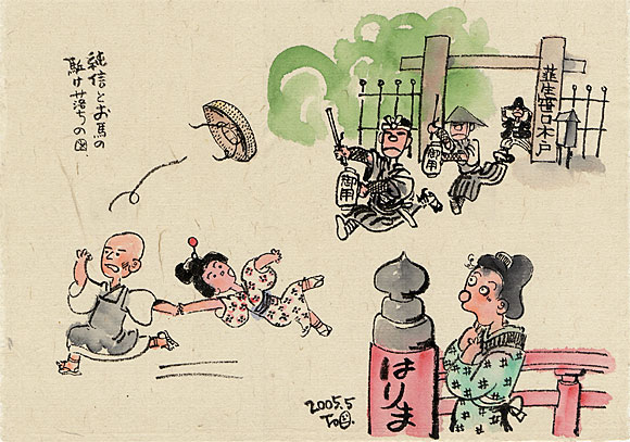 このために、お馬さんと純信のうわさは、またたくまに城下に広がり、二人はたえかねて関所破りまでして、恋の逃避行をはかりました。しかし、となりの国讃岐のこんぴらさんのところで捕まり、高知へ送り返され、純信は伊予へ追放されました。