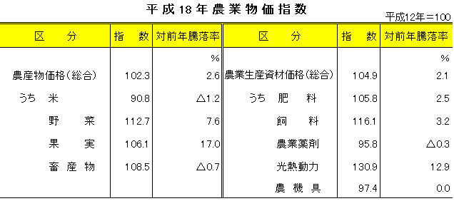 農水省統計部はこのほど、平成18年農業物価指数(平成12年を基準)を公表した。