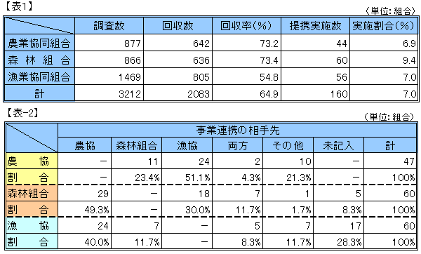 ◆異業種間連携で農山村に関係した事例が対象 組合間の事業連携には、▽同業種間で行われるもの、▽異業種間でおこなわれるもの、▽同業種の系統内で行われるもの、3つに分けることができる。今回は異業種間(農協と漁協など)でおこなわれる連携のうち、農山漁村に密接に関係している事例を取り上げている。とりまとめは、経営局協同組織課、林野庁経営課、水産庁経営課等の省内関係課と、JA全中、全国森林組合連合会、全国漁業協同組合連合会の関係団体が連携して行った。17年8月に行ったアンケートの調査結果や、その後の事業連携を行っている組合の現地調査、有識者を交えた組合との意見交換会、事例発表会などを実施し、事業連携効果や事業連携の進まない理由等を調べ、事業連携を推進する方策を検討し、中間取りまとめを行った。 ◆行政に事業間の調整役を期待 農協、森林組合、漁協とも事業連携を行っているのは1割弱で【表-1】、その相手は農協は森林組合と約2割、漁協と約5割。森林組合は農協と約5割、漁協と約3割。漁協は農協と約4割、森林組合と約1割。森林組合、漁協とも、農協との連携が多い【表-2】。事業連携を行うようになったのは、地場産品(副産物を含む)の販売・PR、地産地消、環境整備などが主な理由となっている。今後については、「現状維持」と「拡大したい」がともに4割で、農協と漁協は「現状維持」、森林組合は「拡大したい」との意見が多くなっている。また、連携を行うためには6割の組合が「行政の関与が必要」と答え、行政に事業間の調整役を期待している。事業連携を行っていない組合では、7割が今後も連携する意向なしと答えている。