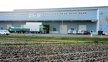 | 平成9年に建設された越場農業倉庫(通称:西部集約倉庫)。1棟2倉庫で合わせて4600トン収容できる。向かって右にモチ米、左にうるち米が。 |