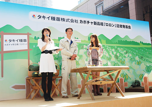 下:新品種カボチャ「ロロン」を笑顔でPRする押切もえさん