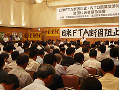 JA全中と全国農政連は8月7日、東京・港区の虎ノ門パストラルで「日米FTA断固阻止・WTO農業交渉対策全国代表者緊急集会」を開き、「日米FTAは日本農業を崩壊させる。断じて認めることはできない」と訴えた(関連記事)。