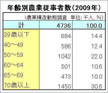 農水省の資料でみると、表で示したように、高齢農業者(55歳以上、高年齢者雇用安定法の定義)は全農業者の約6割を占めている。自民党は、この人たちが農業をしているから、農業構造が脆弱になっている、と考えているようだ。この人たちを邪魔者扱いして冷遇し、農業から引退させることが、自民党の構造政策だ、というのだろうか。