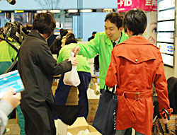 「がんばって」と励まして卵を受け取る人や「なんで卵を配るの?」と聞く人など反応はさまざま。生産者たちは同経営者会議の石澤直士会長を先頭に消費者の質問に懇切に答えていた。