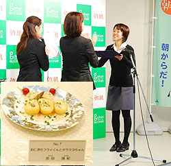 最優秀作品賞は東京都・華学園栄養専門学校の炭田瑞紀さんの「おにぎりフライくんとタラマヨちゃん」。審査委員長を務めた赤堀学園の赤堀博美校長は、「見た目にボリュームあり、色々な食感が楽しめた」と講評。炭田さんは「鳥肌が立つほど嬉しい。これからも、もっと面白い朝ごはんを作りたい」と笑顔で喜んだ。