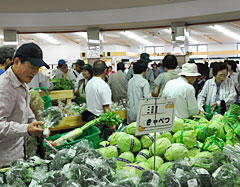 下:新鮮野菜を購入する人でにぎわう店内