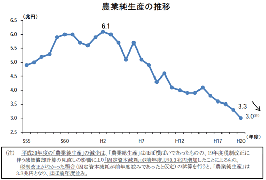農業所得は平成2年には6.1兆円あったがその後低下を続け半減したことになる。