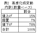 主要品目である高度化成は、基準銘柄である一般(15-15-15)では0.3%の値下げとなる。ただし同じ品目でも成分・銘柄によって変動率は異なるが、全農取扱い数量の85%の銘柄で据え置きまたは値下げとなっている(表2)。
