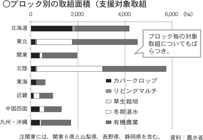 ただし、地域によるばらつきがある。ブロック別でみると面積でもっとも多いのは北陸で6000ha近くになるが、東海や近畿では1000haにも満たない(グラフ)。