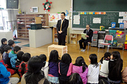 上:子どもらに贈呈品を紹介する神修一・農林中央金庫福岡支店長