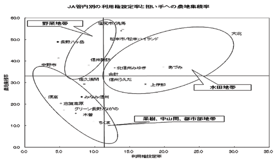 下図がその概要だ。縦軸が農地集積率、横軸が利用権設定率で、県内JAの状況を示している。