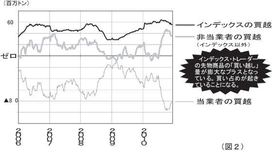 図2がそれを示したもので、インデックス・トレーダーでは、買い持ちから売り持ちを差し引いた「買い越し量」が膨大になっている。すなわち、買い占めが起きていることになる。