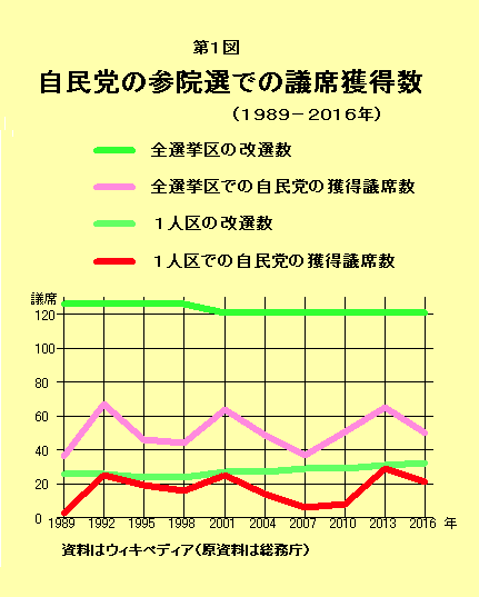 逆に、1人区が20%程度以下のときが、1989年と2007年の2回あって、そのときは、全選挙区では30%程度以下になった。つまり、自民の惨敗だった。