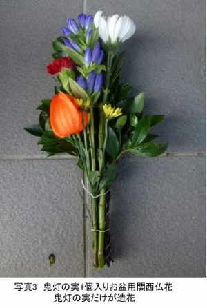 さらに、役物として特別視されている蓮、鬼灯も生産が不安定なことや、蓮はつぼみのままで咲かず、鬼灯は実で動きがないので、造花で代用することが増えています(写真3)。