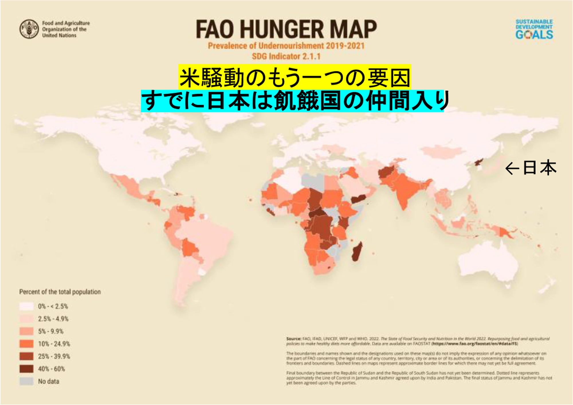 コメ騒動を深刻化した一つの要因は消費者側にある。国民の所得低下だ。実は、国連の「飢餓地図」を見ると、日本はピンク色になっており、アフリカ諸国などとともに、世界で最も栄養不足人口が多い国に分類されている。日本が先進国だと思っているのは日本人くらいだ、とさえ漏れ聞こえてくる。「日本が飢餓に陥る」のではなく、「日本はすでに飢餓国」なのだ。
