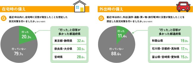直近1年以内に在宅時、災害が発生したことを想定した防災対策を「行った」と回答した人は20.3%。都道府県別にみると「行った」の回答が多かったのは東京・静岡が32.4%、次いで奈良・大分が30.5%。また、在宅時に災害が発生したときに備え、防災対策ができていると回答が多かったのは「懐中電灯」で2位は「避難先の確認」、3位は「水や食料の備蓄」と続いた。