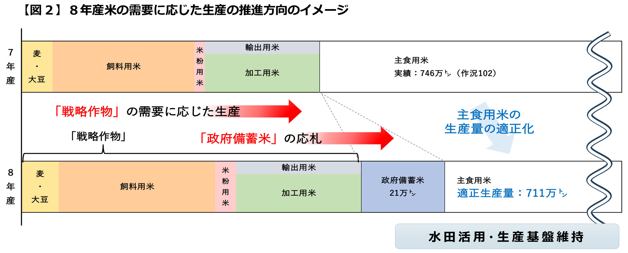 主食用米については、各県で、自県産米の販売・在庫状況を検討し生産目安・推進計画を見直す。主食用米の過剰作付けは回避しつつ、主食用米の生産量として国が示す711万tを上回る分は、政府備蓄米、戦略作物(輸出用、加工用、米粉用、飼料用、麦・大豆)を推進する。麦・大豆は、国のゲタ・関連対策をフル活用し、実需者の需要に応じ安定生産を行う(図2参照)。