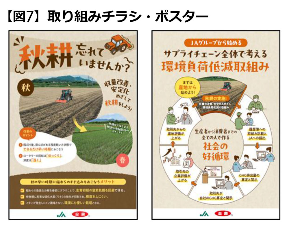 環境については、温室効果ガスの低減のため、秋耕(秋の稲わらすき込み)を呼びかけている。26年産からは「JA米」の要件の中に、栽培ごよみと履歴帳簿に秋耕・中干し期間の記入欄を設け記入することを必須とした。ただし、秋耕実施を要件化するものではない(図7参照)。