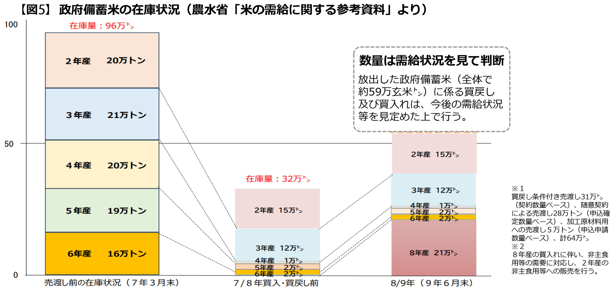 100万tが適正在庫とされる政府備蓄米は、25年の備蓄米放出と買い入れ入札の中止等によって、現在、在庫が約32万tとなっている。26年産での21万t買い入れは決まっていて、今後入札が行われる。25年に放出された59万tのうち31万tは買い戻し条件付きで国が売り渡しているので、その買い戻しが需給を左右するポイントになる。適切な時期に国への売渡しに向けて協議していく(図5参照)。