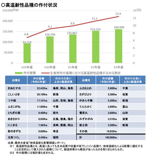 また、地球温暖化に伴い高温傾向が続くことが見込まれるため、高温耐性品種の拡大を進める必要があるとしている。