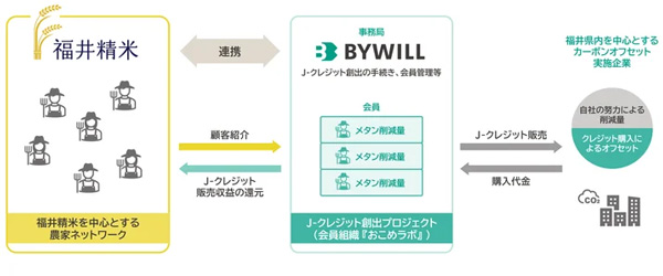 福井精米は、バイウィルが運営する「水稲栽培における中干し期間延長」によるJ-クレジット創出プロジェクト(会員組織名「おこめラボ」)に関して、ニーズを有する取引先農家をバイウィルに紹介する役割を担う。