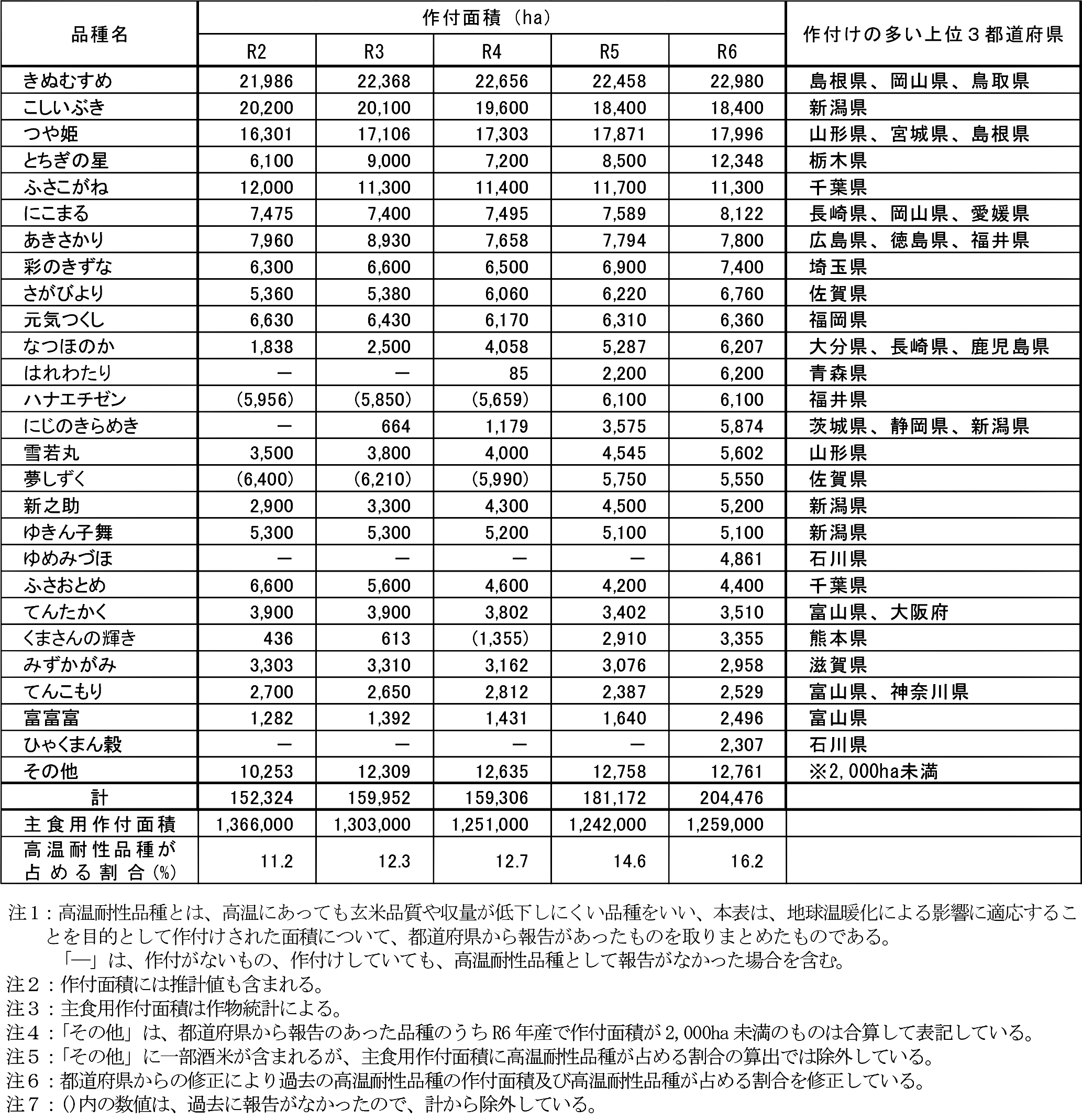 高温耐性品種の作付面積は2020年には15万2000haだったが、毎年増加し23年には18万1172ha、24年には20万4476haとなり、全国の主食用作付面積に占める割合は16.2%となった。