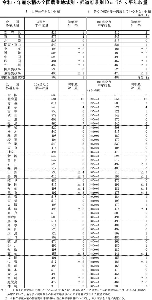農水省は2015年から生産現場の実態を踏まえた「多くの農家等が使用しているふるい目幅」での平年収量も公表している。全国では515kgとなる。