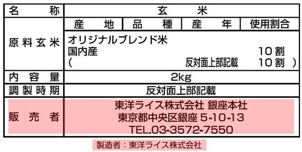 ・「販売者」または「製造者」として「東洋ライス株式会社」と明記