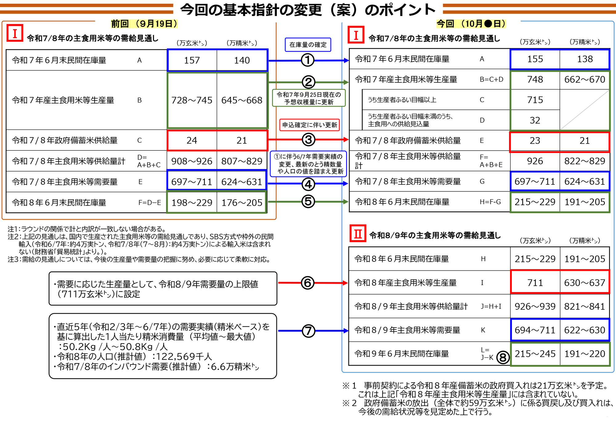 また、政府備蓄米の供給量は9月の指針では24万tとしていたが、申込みが確定したため23万tに変更する。6月末の民間在庫量は155万tに確定した。