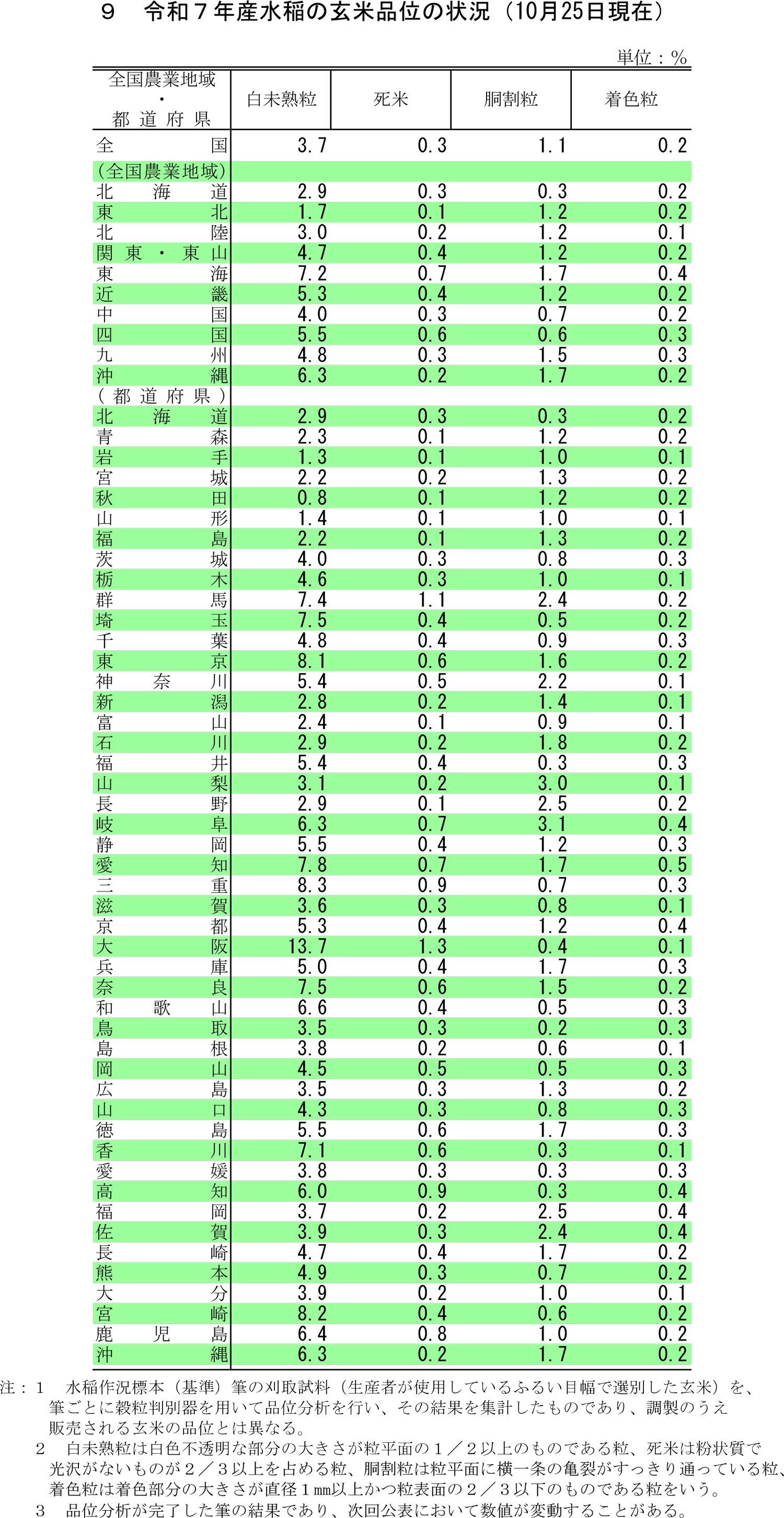 その結果、全国ベースで白未熟粒は3.7%、死米(粉状質で光沢がない部分が3分の2以上占める粒)は0.3%、胴割粒は1.1%、着色粒は0.2%だった。ただ、地域差も大きい。