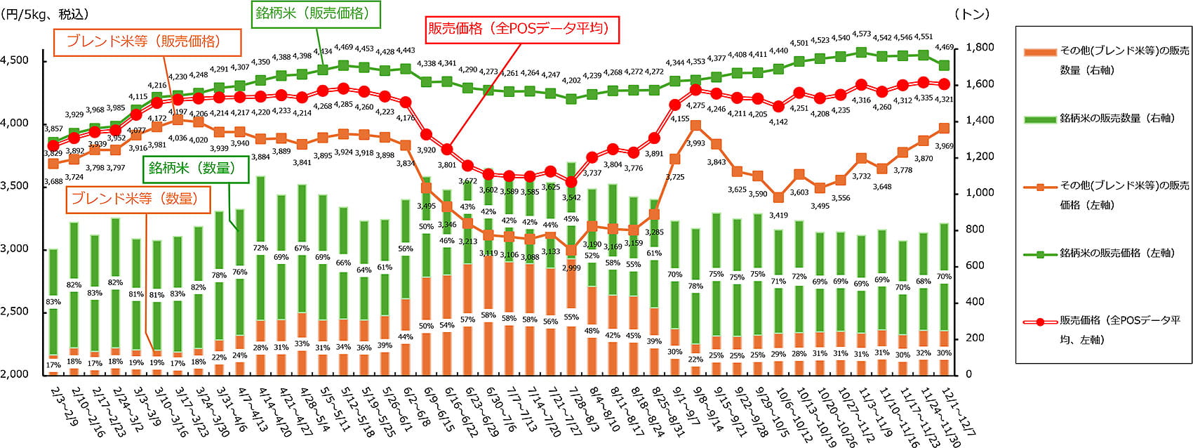 銘柄米価格は下がりブレンド米価格は上昇