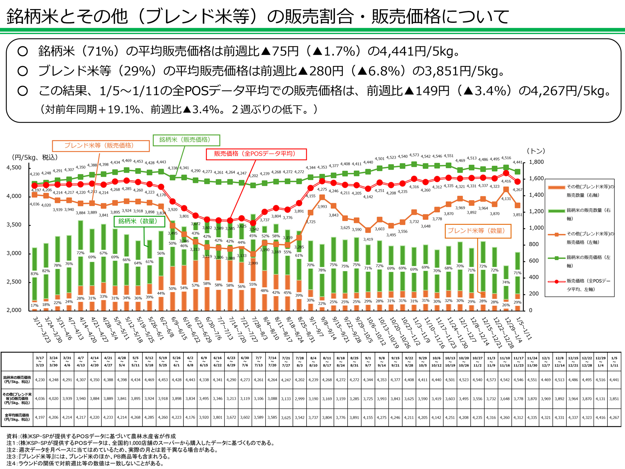 銘柄米の平均販売価格は前週より75円下がって、5kg当たり4441円となった。ブレンド米は前週より280円下がって同3851円となった。