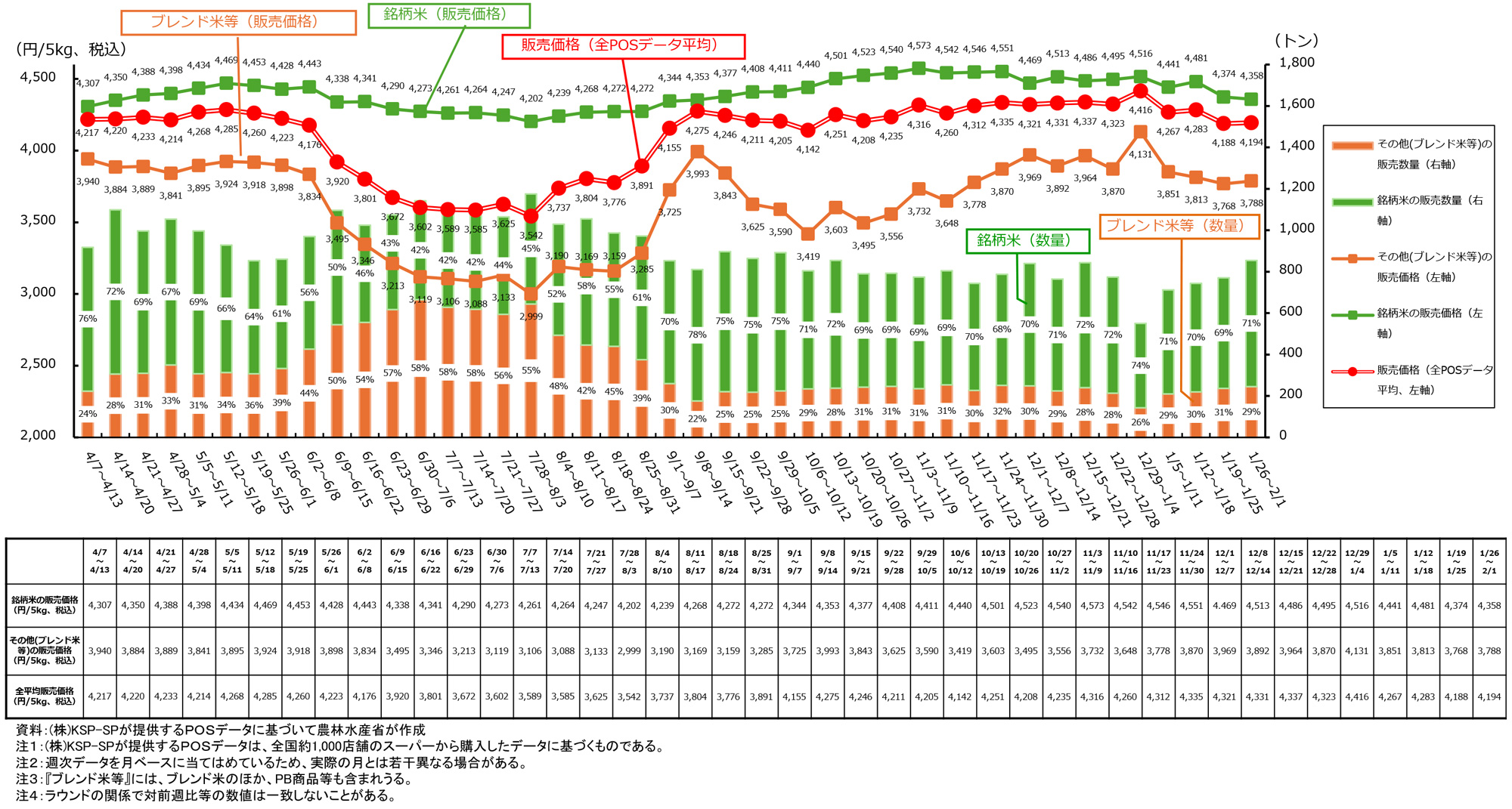 平均価格については、2025年6月以降、随意契約による政府備蓄米(いわゆる小泉米)売り渡しで下がったが、8月以降は新米の出回りで上昇した。9月以降は5kg4000円を上回る水準が22週間続き「高止まり」してきた。