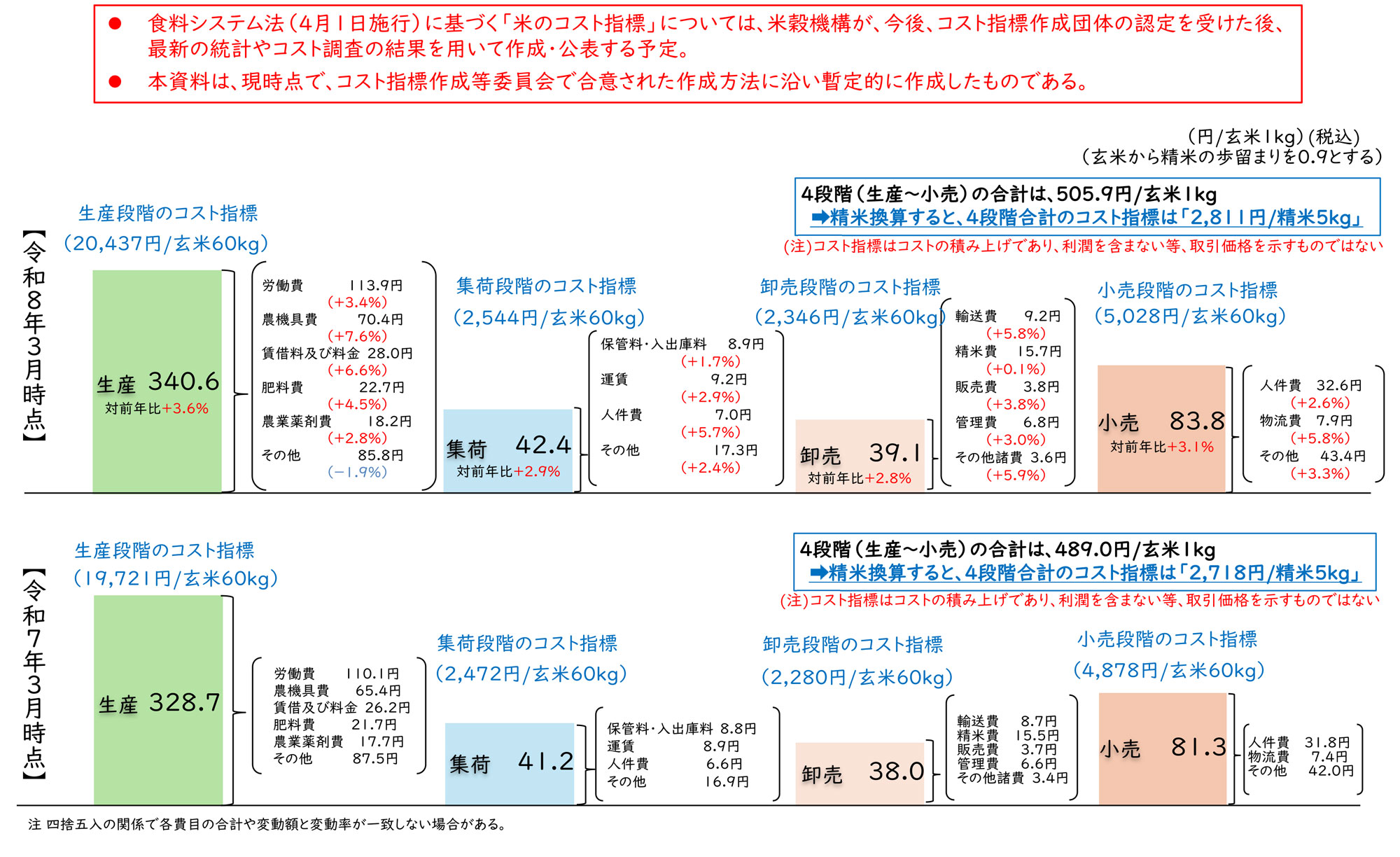 これはコストだけを積算したもので、各取引段階での利益は含まないため、合理的費用に平均的利益をのせて取引されると、玄米60kg当たり生産者手取りは2万437円より高く、精米5kg当たり小売価格も2811円より高くなる。逆にこれを下回る価格での取引は、平均的にみるとコスト割れになる。