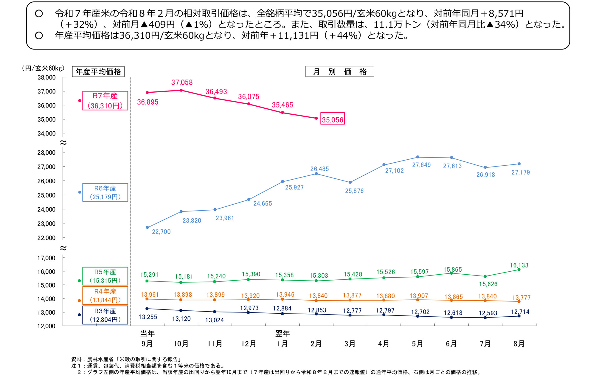 全銘柄平均の相対取引価格は玄米60kg3万5056円で前月より409円、1%下落した。昨年11月から4か月連続で下ったが、対前年同月比では同8571円、32%高い。年産平均価格は同3万6310円で対前年で1万1131円、44%高い。