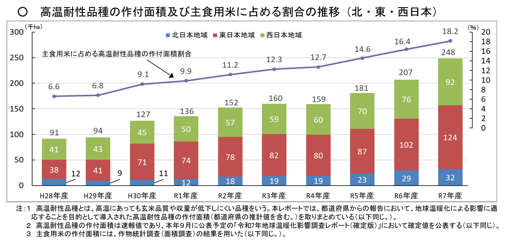 高温耐性品種の作付面積がもっとも多い地域は東日本で12万4000ha(前年比2万2000ha増)、ついで西日本が9万2000ha(同1万6000ha増)、北日本が3万2000ha(同3000ha増)となった。