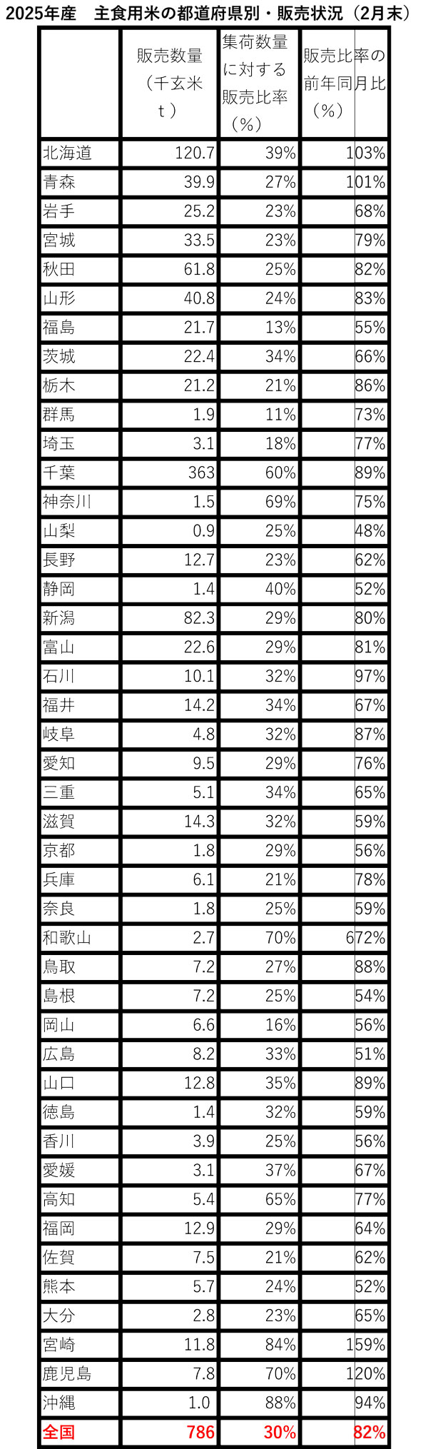 25年産米の都道府県別の販売状況をみると、昨年と同水準、または上回っている地域はごくわずかでほとんどの県で販売は振るわず、在庫が積み上がっている。