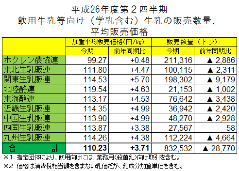 中央酪農会議は10月29日、平成26年第2四半期の飲用牛乳等向け(学乳含む)生乳の販売数量と平均販売価格のとりまとめを公表した。