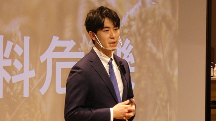 「クオンクロップ(株)」の北垣卓代表取締役は、地球温暖化が大きな社会問題となる中、同社が開発したアプリ「MYエコものさし」について「消費者がサステナブルな食を知って、選べて、応援できるスマートフォンアプリです」と紹介、ゼロからスタートした事業が伴走者の支援で10月にパイロット版のリリースまでこぎつけたことを報告した。
