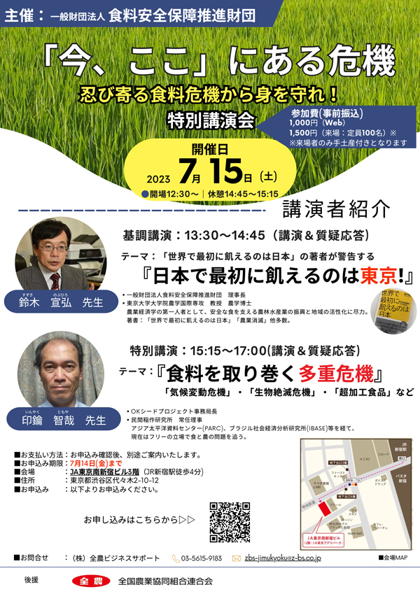 (一社)食料安全保障推進財団(理事長:鈴木宣弘)は7月15日にJA東京南新宿ビルで「今、ここにある危機~忍び寄る食料危機から身を守れ!~」と題した特別講演会を開く。