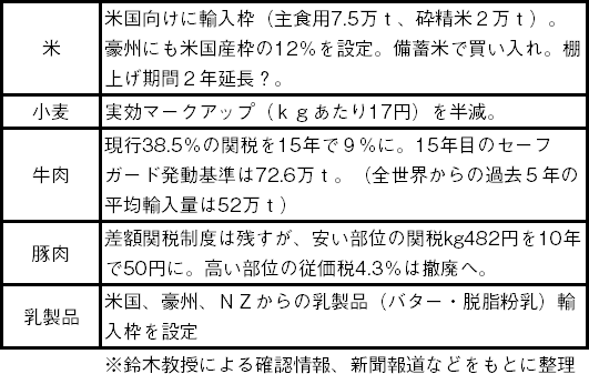 それらをまとめたのが掲載した表である。米については主食用で年7.5万トン、砕精米で同2万トンの米国優先枠を設けるとされ政府備蓄米として買い入れて隔離し、市場に影響を与えない方策が検討されているのだという。豪州とベトナムにも若干ではあっても