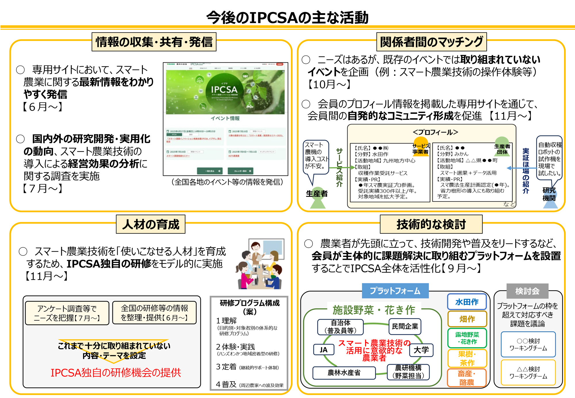 ICTやAIの進展でスマート農業の製品・サービスは増えている。しかし、現場での普及には、有用性、コスト、操作性、サービス間の情報連携といった課題が立ちはだかる。こうした課題に対応するため、IPCSAは生産者の要望を基点とした技術検討や分野ごとのプラットフォームを作り、実機展示や体験イベントなどを通じて、現場に根差した普及を進める。