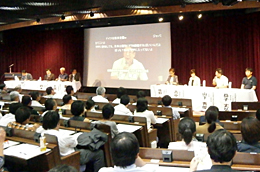 シンポジウムの風景。大きく映し出されたビジョンには、ネットを通じて視聴者のコメントが随時書き込まれていった。